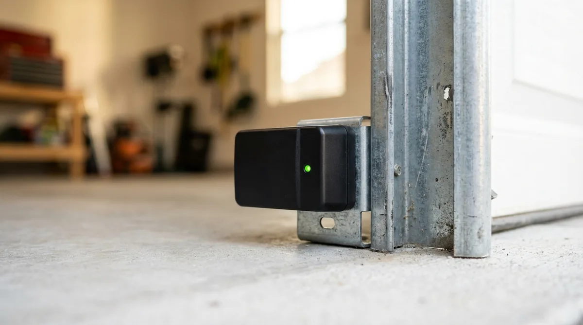 The most common implementation of this requirement is the photo-eye sensor system. Two small sensor units are mounted on the door tracks, typically 4 to 6 inches above the floor. One unit — the sender — continuously emits an invisible infrared beam. The other unit — the receiver — sits directly across the opening and monitors that beam. When the beam is intact, the door is allowed to close normally. The moment something breaks the beam — a child, a pet, a bicycle left in the way — the opener immediately reverses.